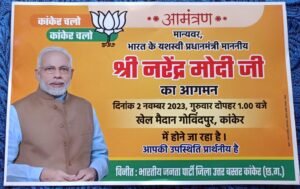 कांकेर – भारतीय जनता पार्टी के शहर मंडल अध्यक्ष गिरधर यादव ने भारत के प्रधानमंत्री नरेंद्र मोदी के कांकेर नगर आगमन को लेकर आम जनता को आमंत्रित करतें हुए कहां हैं की बड़े ही हर्ष व उल्लास के साथ आपको सूचित कर रहे हैं कि देश के यशस्वी प्रधानमंत्री आदरणीय नरेन्द्र मोदी जी दिनांक 02 नवंबर 2023 दिन – गुरुवार समय – दोपहर 01: 00 बजे स्थान – गोविन्दपुर खेल मैदान में हम सबको सम्बोधित करेंगे…..आप सभी परिवार सहित सादर आमंत्रित हैं…..आप इस अवसर पर अपनी उपस्थिति अवश्य सुनिश्चित करें।